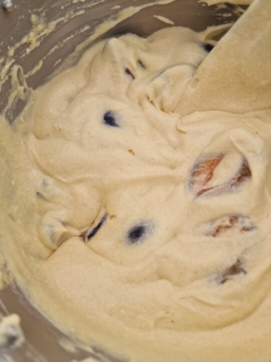 Comece por bater muito bem a manteiga com o açúcar. Quando ficar um creme, acrescente os ovos inteiros e a essência de baunilha e continue a bater. Acrescente o iogurte, e por último, envolva a farinha com o fermento. No final acrescente as ameixas e envolva. Utilizei ameixas, mas pode ser outra fruta da época.