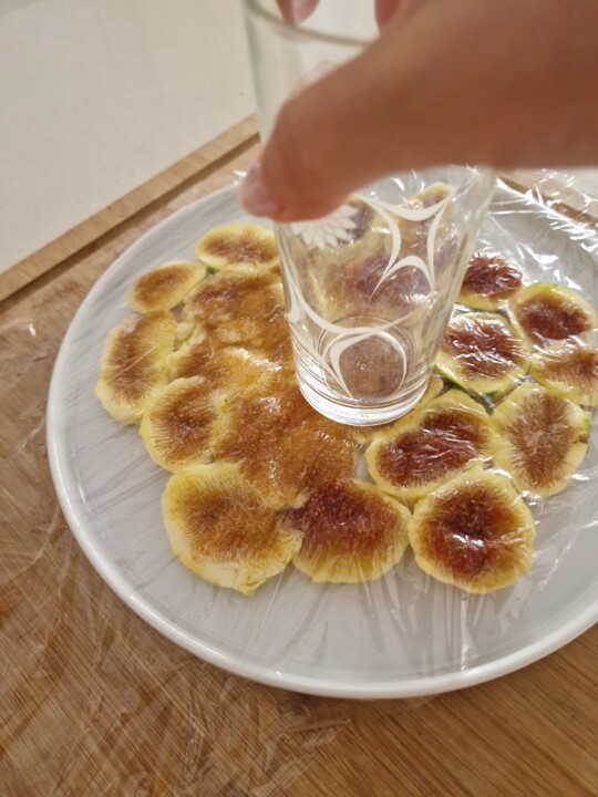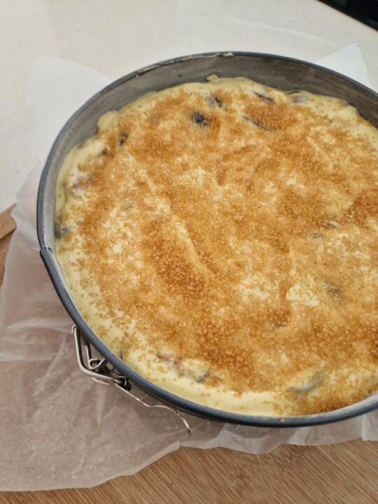 Utilize uma forma de mola, usei a de 24cm), forre a base com papel vegetal. Unte a forma com manteiga e polvilhe com farinha. Coloque a massa na forma e alise ligeiramente o topo e polvilhe com o açúcar mascavado.