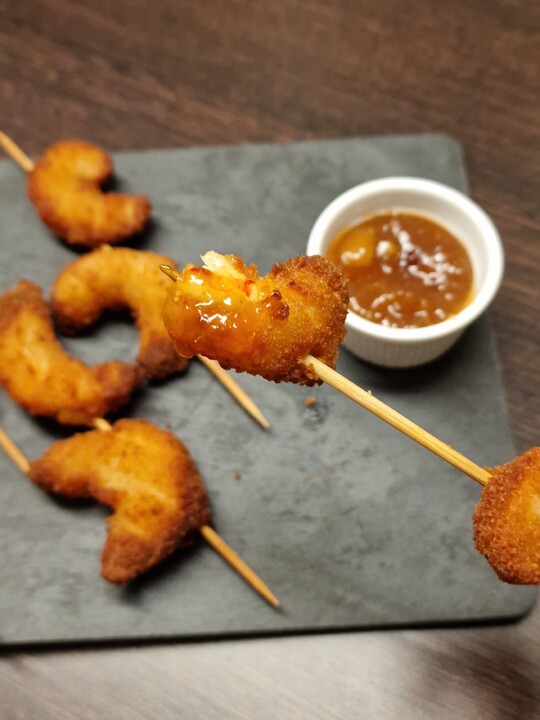 Ainda em modo festa, estas espetadas de camarões panados são uma entrada fantástica, crocante por fora e suculenta por dentro. Acompanhados por um molho agridoce ou de piripiri, ficam perfeitos. Eu usei, chutney de manga, mas pode ser um molho agridoce.