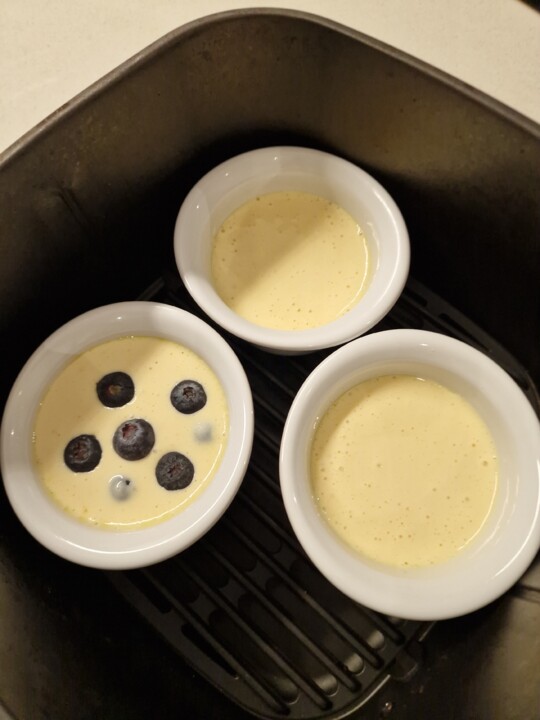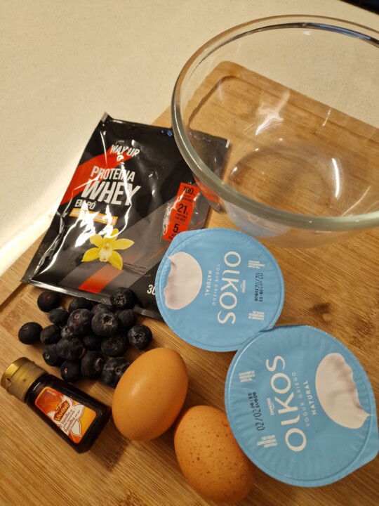 Numa taça misture os iogurtes e os ovos, bata muito bem. Acrescente a proteína e incorpore, até ter um mistura homogénea. Use um batedor de varas para misturar melhor. Eu ainda acrescentei alguma essência de baunilha, para ter mais sabor. Unte três recipientes para ir ao forno com manteiga ou óleo vegetal, verta o preparado, cerca de 3/4 das taças. Como eu fiz para experimentar, numa delas acrescentei uns mirtilos. Leve ao forno ou airfryer, cerca de 180°C cerca de 20 minutos. Observando o resultados, na próxima apenas irei deixar 15 minutos, é um tipo de pudim muito rápido. Podem ser servidos com uma compota a gosto.