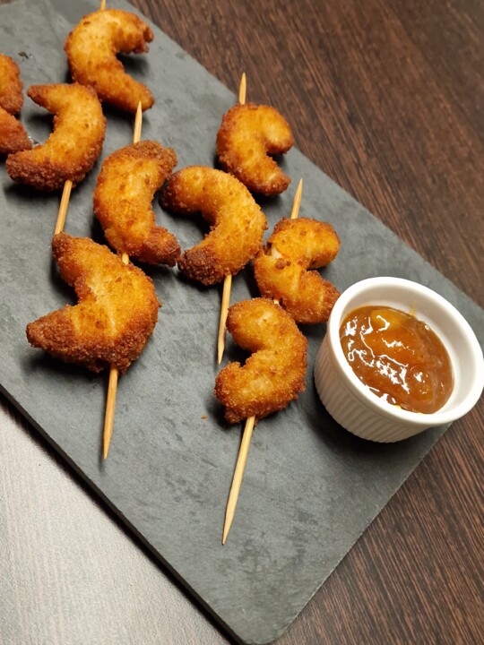 Ainda em modo festa, estas espetadas de camarões panados são uma entrada fantástica, crocante por fora e suculenta por dentro. Acompanhados por um molho agridoce ou de piripiri, ficam perfeitos. Eu usei, chutney de manga, mas pode ser um molho agridoce. ​alguns 10 camarões grandes descascados, mas podes deixar a cauda se preferiresfarinha de trigo2 ovos batidospão ralado​sal, pimenta preta, alho em pó e um toque de sumo de limãoespetos de madeira ​ Limpe os camarões e retire (...)