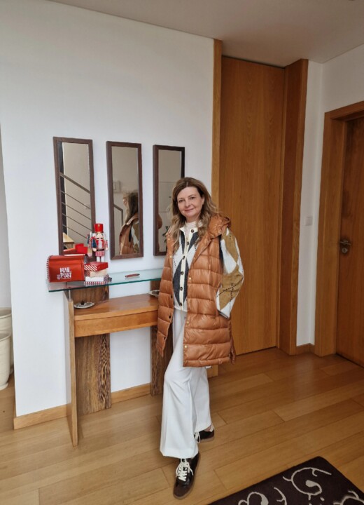 Nada como um conjunto que equilibra o clássico e o moderno, uma aposta nestas calças brancas, uma tendência que veio para iluminar os dias mais frescos e dar aquele toque de elegância imediato. Para completar, um casaco com padrão aos losangos e um colete acolchoado laranja da Lanidor, uma cor que traz uma energia ao visual.