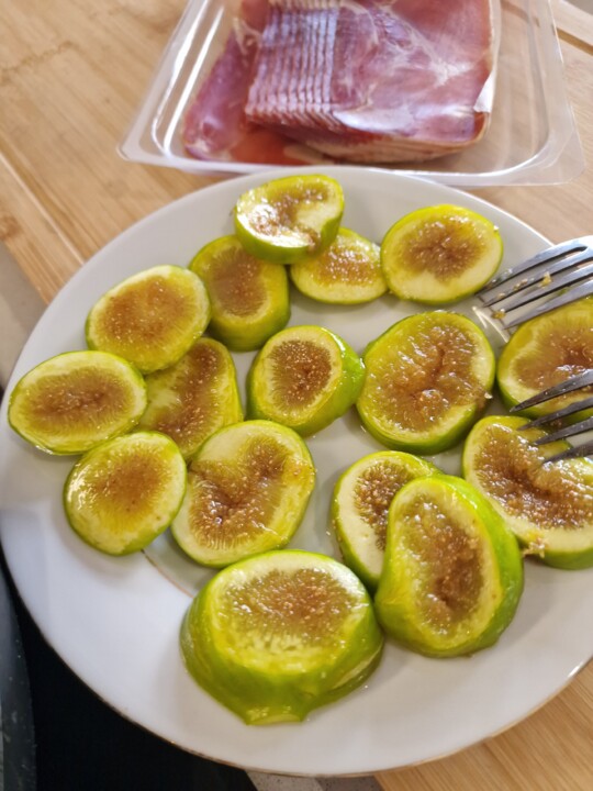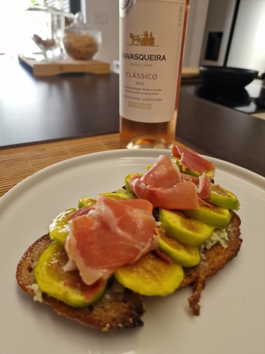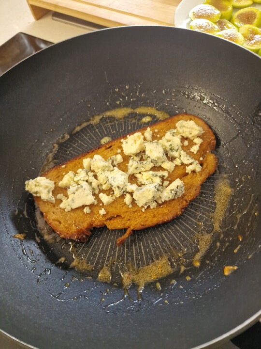 Corte os figos em fatias e caramelize-os numa frigideira, para não queimarem, nem colarem, utilize um pouco de água. Retire e reserve, na mesma frigideira, sem limpar, derreta um pedaço de manteiga e uma colher de mel, coloque o pão para torrar e absorver esses sabores. Quando estiver bem tostado, vire o pão e adicione cima da parte torrada os cubinhos de queijo azul ou gorgonzola. Esses queijos são bastante fortes, basta uns cubinhos, tape para derreterem ligeiramente. Retire a tosta para um prato de servir e espalhe bem o queijo, adicione os figos caramelizados e para terminar o presunto cru.